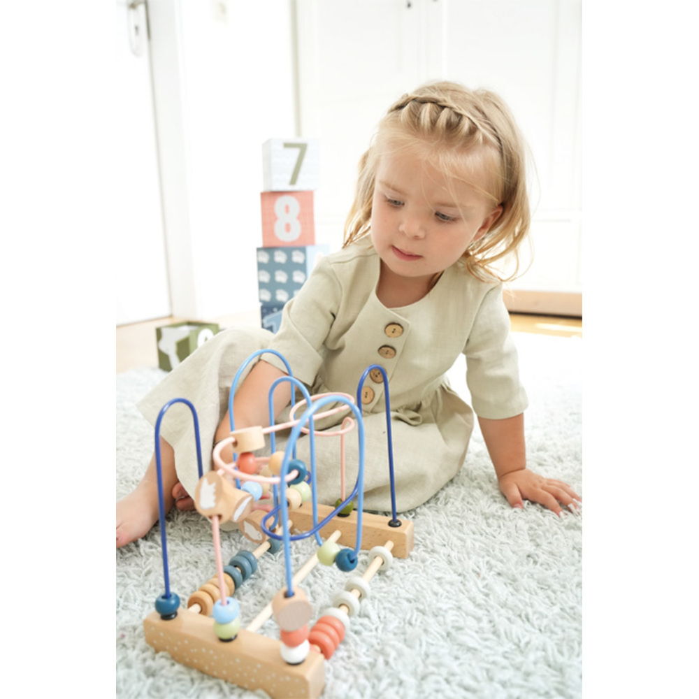 Ce circuit de motricité complet sollicite la motricité fine, notamment la pince pouce-index, en guidant les perles le long des structures métalliques complexes. La présence de bouliers à la base permet également une initiation précoce au dénombrement et à la logique mathématique.