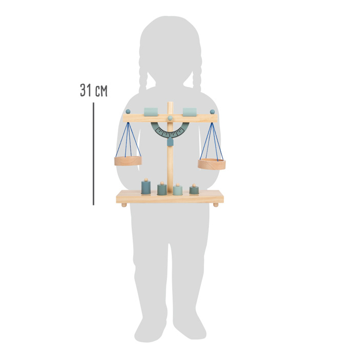 Cette balance romaine traditionnelle est un outil éducatif formidable pour introduire les concepts physiques de masse, de volume et d’équilibre. En manipulant les poids et en observant les oscillations du fléau, l’enfant expérimente concrètement le principe de pesée, renforçant ses capacités de logique mathématique tout en enrichissant le jeu symbolique de la marchande.