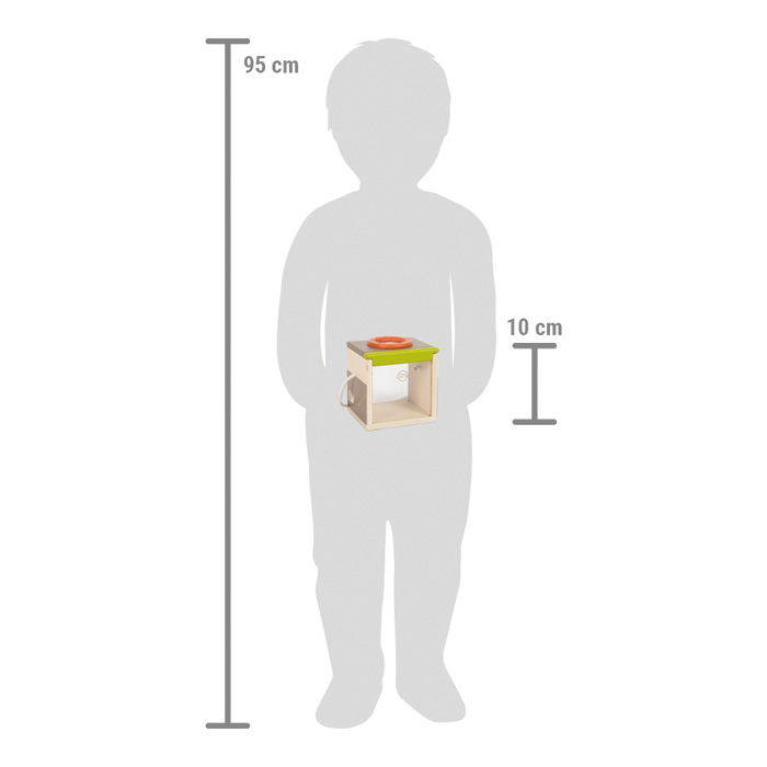 La boîte dispose d’une vitre en acrylique coulissante vers le haut, permettant d’insérer délicatement des végétaux et des insectes. Grâce aux deux parois transparentes et à la loupe grossissante x5 située sur le dessus, l’enfant bénéficie d’une vision panoramique à trois côtés. Des trous d’aération garantissent le bien-être temporaire de l’animal observé.
