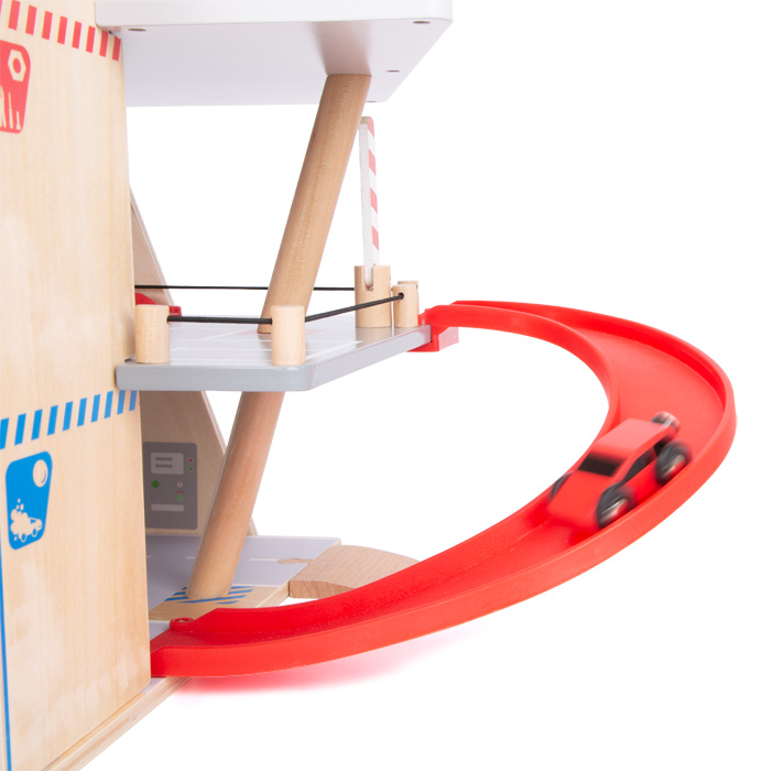 La structure intègre une rampe continue permettant aux véhicules de descendre du sommet jusqu’en bas en un seul mouvement fluide. Le garage est équipé d’un ascenseur avec système de blocage, d’une station de lavage à rouleaux mobiles, d’un pont élévateur mécanique et de pompes à essence/électrique magnétiques. Sa compatibilité avec les circuits de train en bois et les autres routes du marché en fait un hub central pour l’espace jeux.