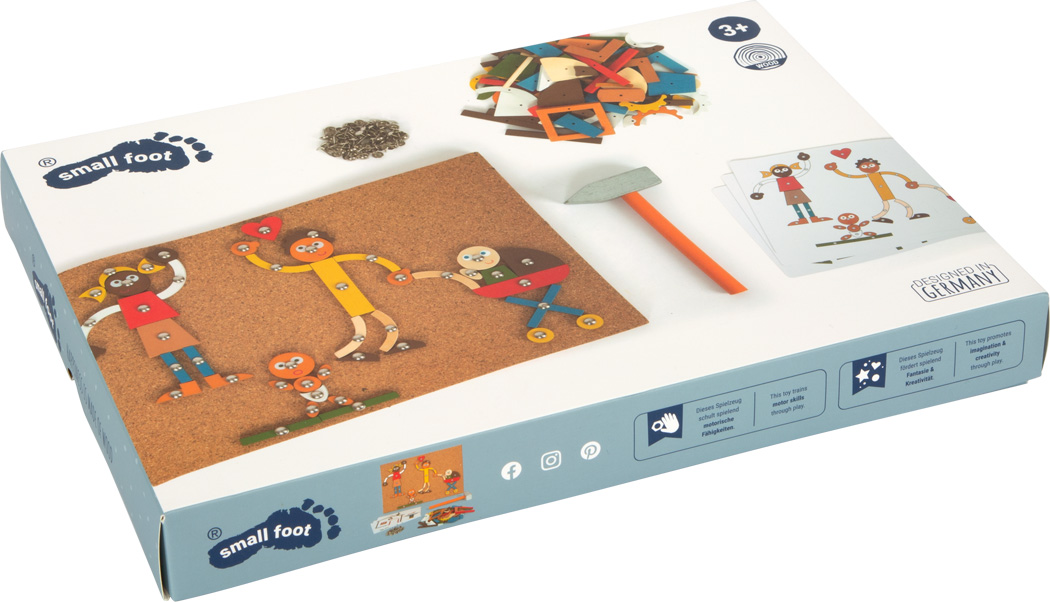 - Contenu : 1 plaque de liège, 1 marteau en bois, 137 clous décoratifs, 145 plaquettes en bois (personnages, accessoires), cartes modèles.