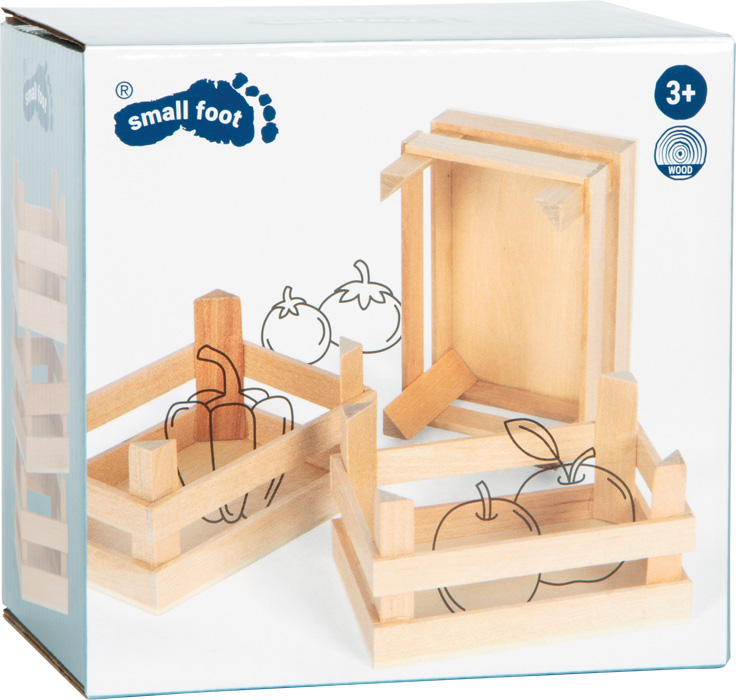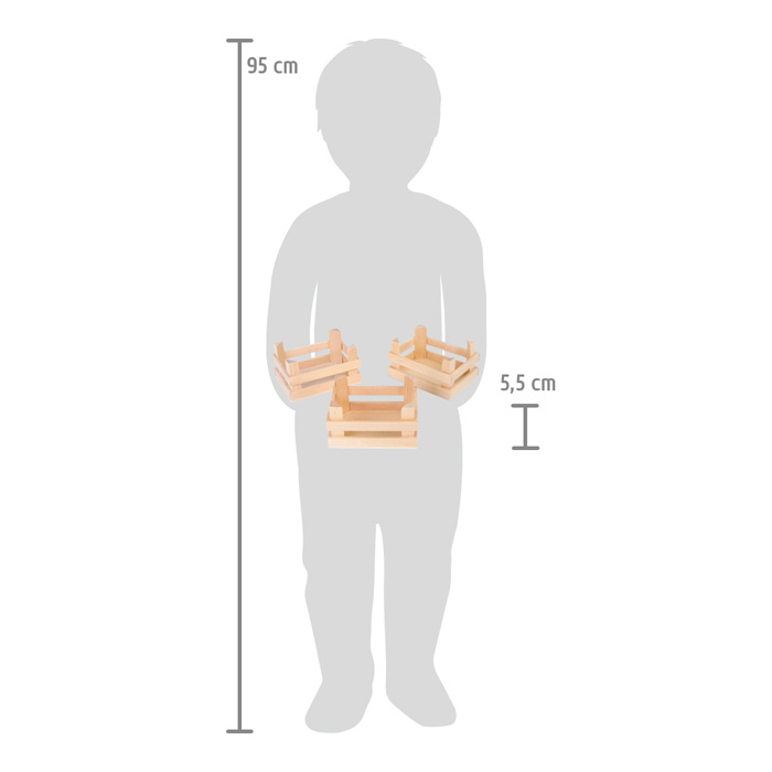 Ce set de trois cagettes en bois brut offre une polyvalence pédagogique remarquable. Accessoires indispensables pour le jeu d’imitation (présentation des fruits et légumes dans la marchande), elles servent également de support éducatif pour les activités de tri et de classification (méthode Montessori) ou de petits rangements favorisant l’autonomie de l’enfant dans la gestion de son espace.