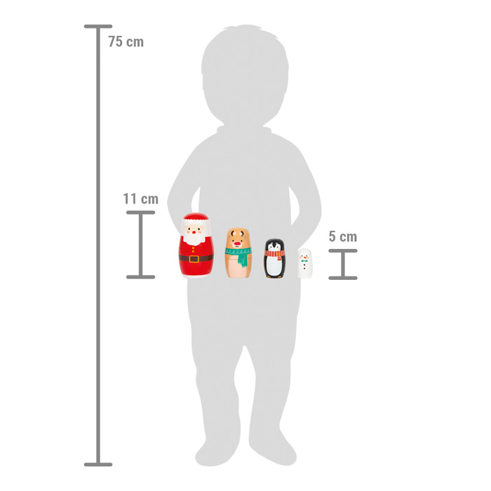 Sur le thème hivernal, ces 4 figurines (Père Noël, Renne, Pingouin, Bonhomme de neige) s’emboîtent parfaitement les unes dans les autres. En bois solide, elles sont conçues pour résister aux manipulations répétées. L’activité de « cacher/trouver » les personnages suscite la curiosité et permet d’introduire des notions de grandeur (petit, moyen, grand) et de contenance.