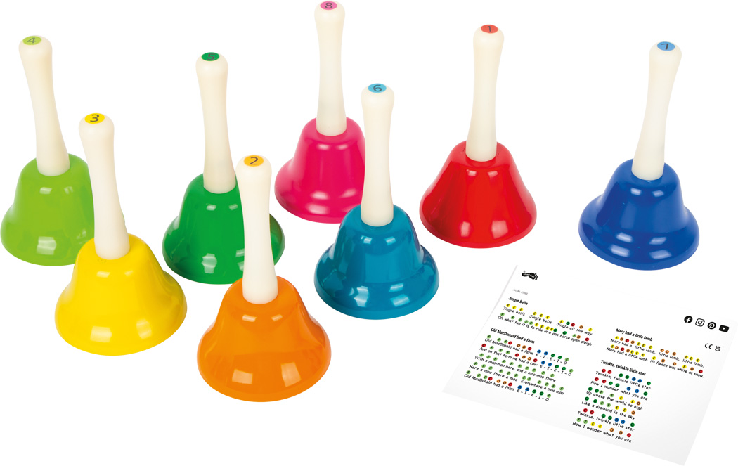 - Contenu : 8 cloches accordées (Gamme diatonique), 1 feuillet de partitions.